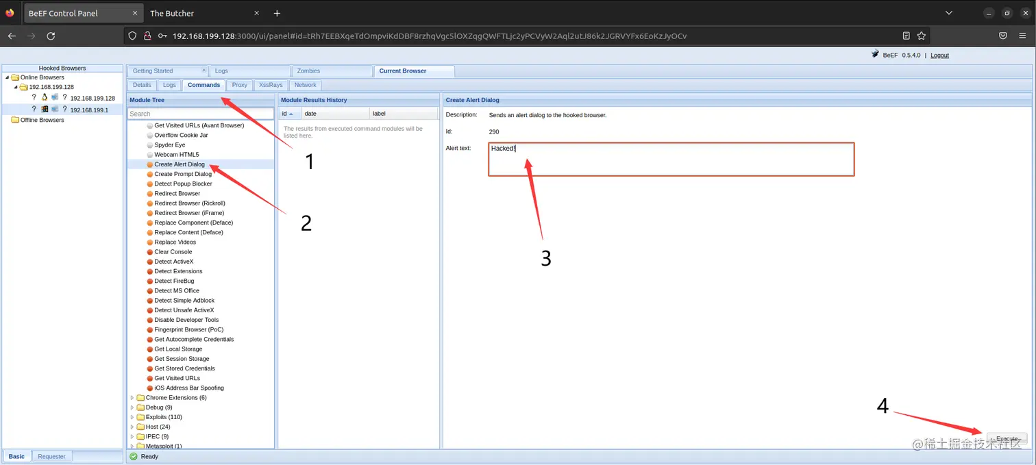其中BeEF就是一款常见的恶意网站构筑脚本,除了弹窗还有很多其他的攻击命令可以自行探索尝试一下。比如 XSS 攻击经常会有的 窃取 cookie 的操作之类的,更换一下注入的恶意脚本即可。当然仅供学习。