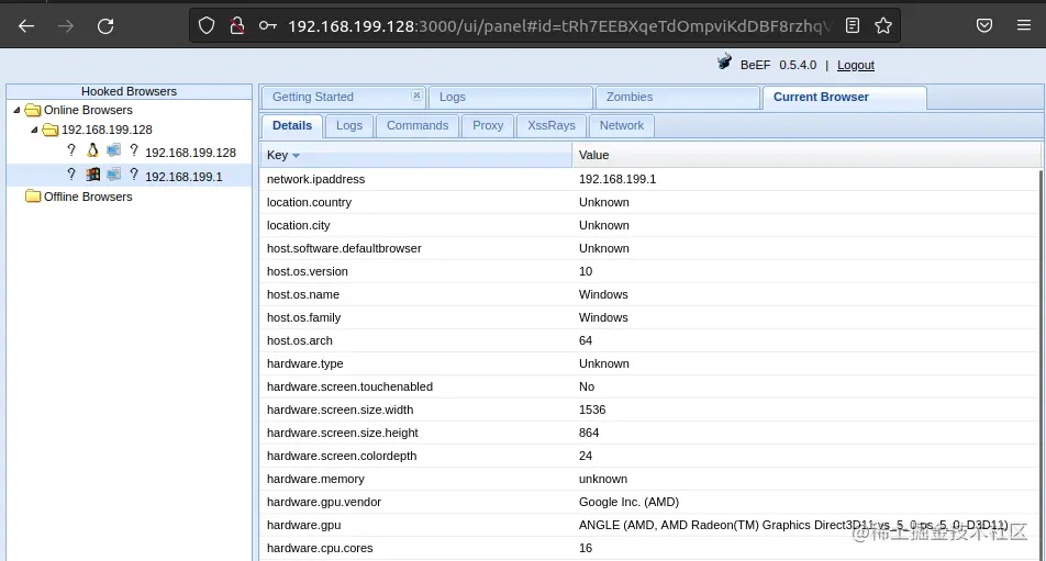 于是我们就使用 BeEF 让被攻击者的浏览器执行了我们准备好的脚本,完成了 XSS 攻击