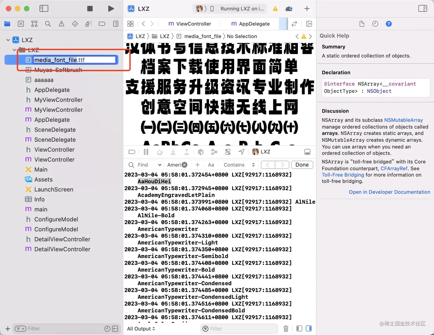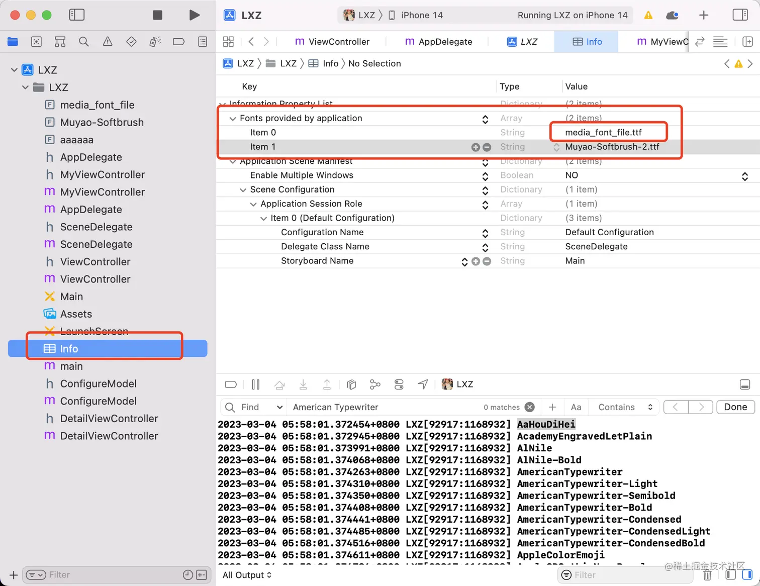 3、在info.plist中添加Fonts provided by application, 数组中添加你的字体文件名称