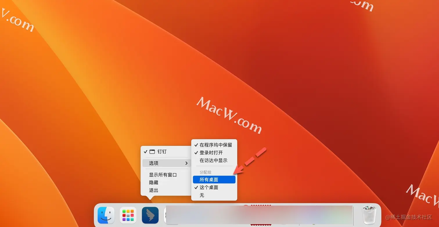 App默认只在一个桌面空间中使用,此时在其他桌面中点击App时,会自动切换回原先打开过的桌面中,如果想在多个桌面中同时使用,可以在程序坞已启动App上右键-选项-分配给-所有桌面即可。