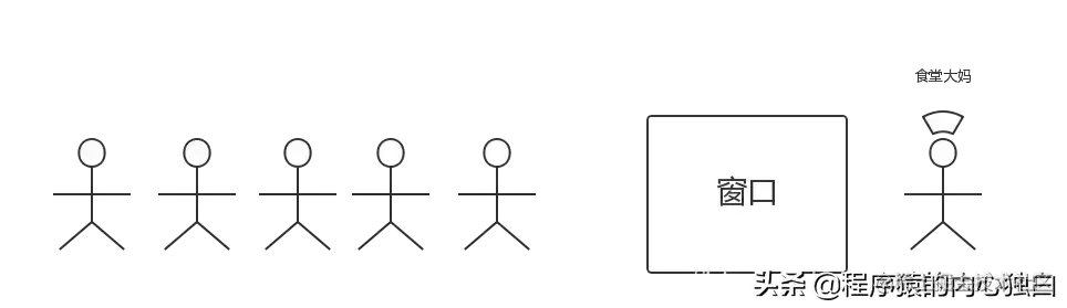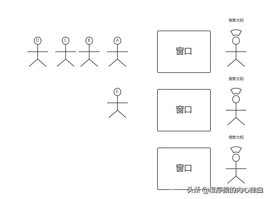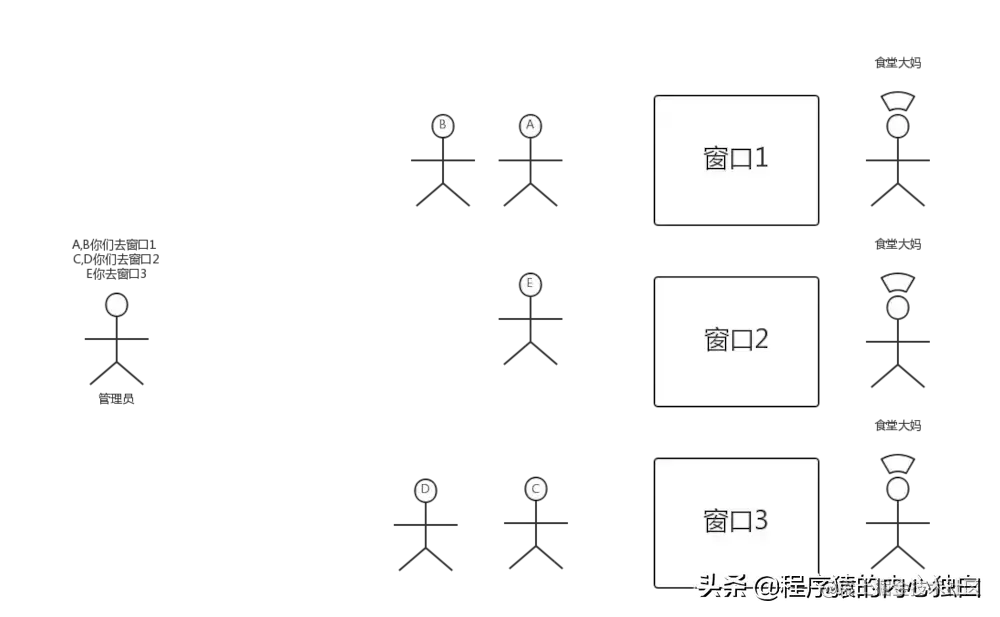 如图所示你会发现我多添加了两个窗口 但是第一个窗口排队的人还是很多 第三个窗口都没有人排队 这就反应了一个问题 虽说窗口增多了 但是排队的人都在低头玩手机 全然不知道窗口已经增加了 如果是这个样子的话那么就会造成资源的浪费 所以我还需要一个管理员 帮助学生排队保证他们能以最快的速度吃上饭
