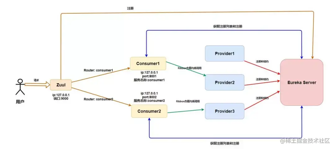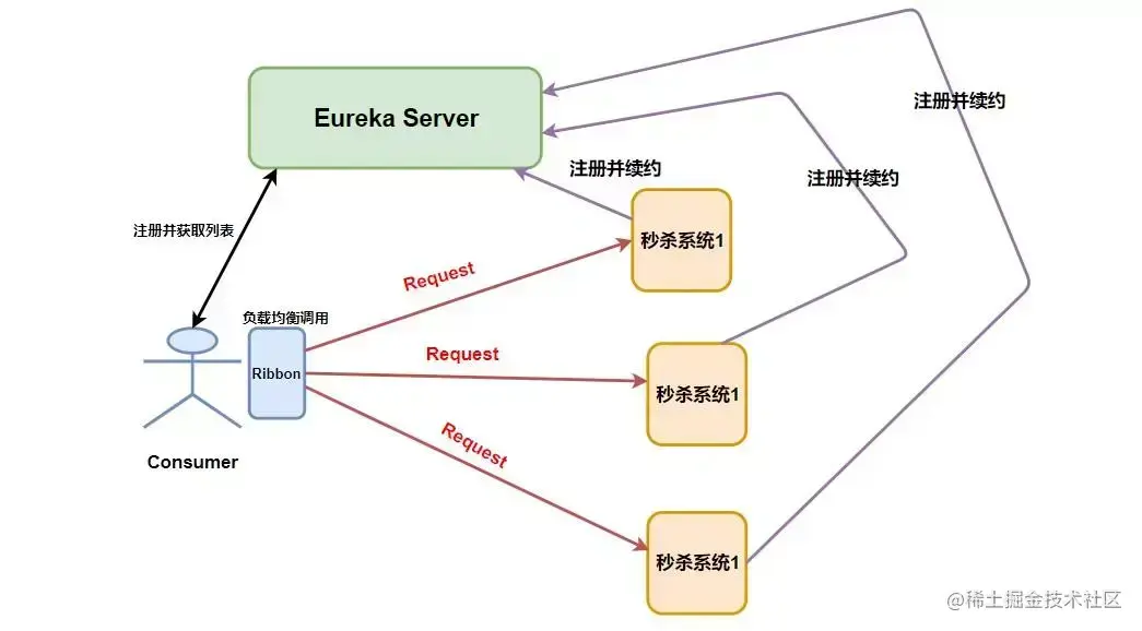 结合中介理解:租客(消费者[Eureka] Client Consumer) 去中介 (服务器[Eureka] Server) 那里获取所有的房屋信息列表 (客户端列表[Eureka] Client List) ,而且租客为了获取最新的信息会定期向中介 (服务器[Eureka] Server) 那里获取并更新本地列表。