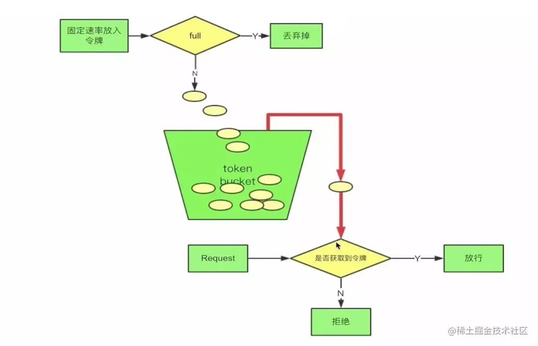 首先我们会有个桶,如果里面没有满那么就会以一定固定的速率会往里面放令牌,一个请求过来首先要从桶中获取令牌,如果没有获取到,那么这个请求就拒绝,如果获取到那么就放行。很简单吧,啊哈哈、