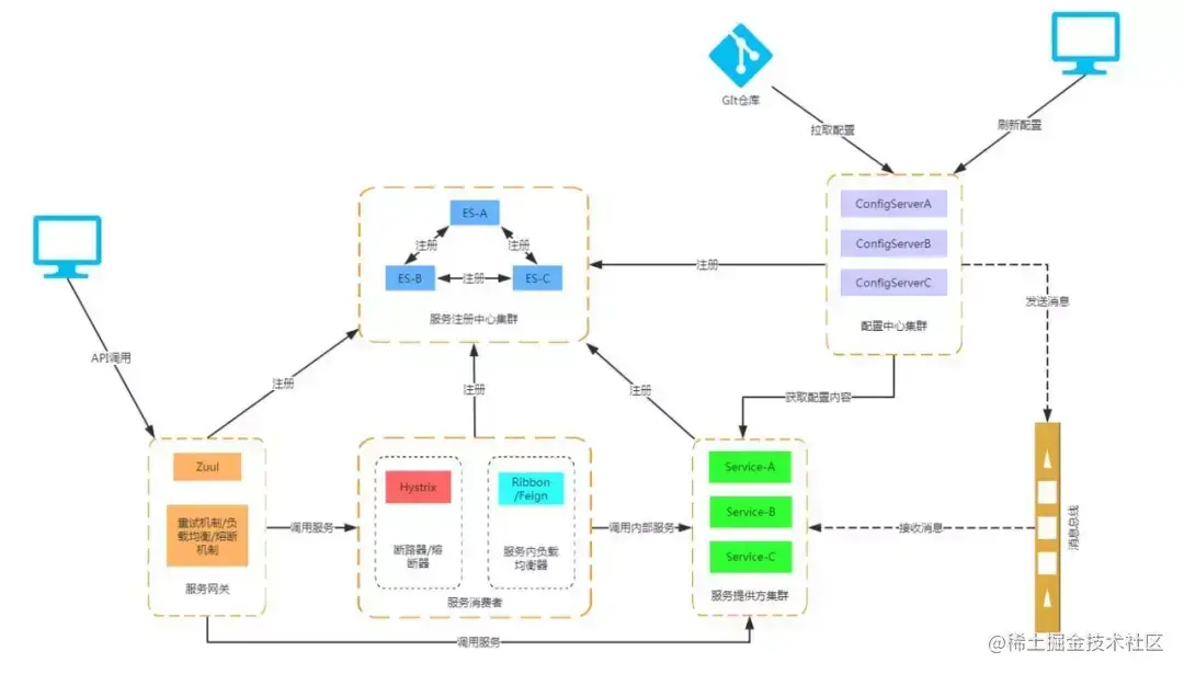 如果你能这个时候能看懂下面那张图,也就说明了你已经对Spring Cloud微服务有了一定的架构认识。
