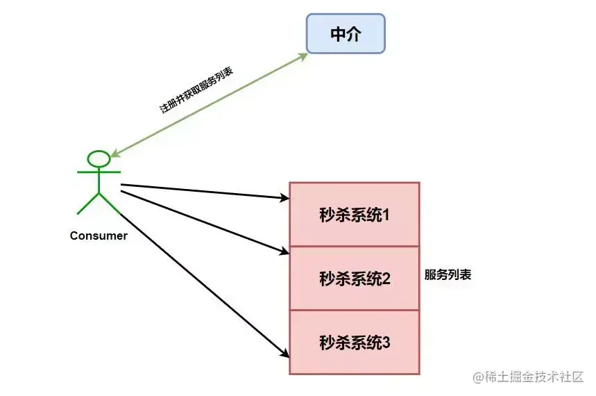 我们再举个例子,比如我们设计了一个秒杀系统,但是为了整个系统的高可用,我们需要将这个系统做一个集群,而这个时候我们消费者就可以拥有多个秒杀系统的调用途径了,如下图。