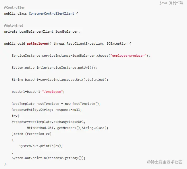 之前的代码,有像NullPointer这样的例外的机会,并不是最优的。我们将看到如何使用Netflix Feign使呼叫变得更加轻松和清洁。如果Netflix Ribbon依赖关系也在类路径中,那么Feign默认也会负责负载平衡。
