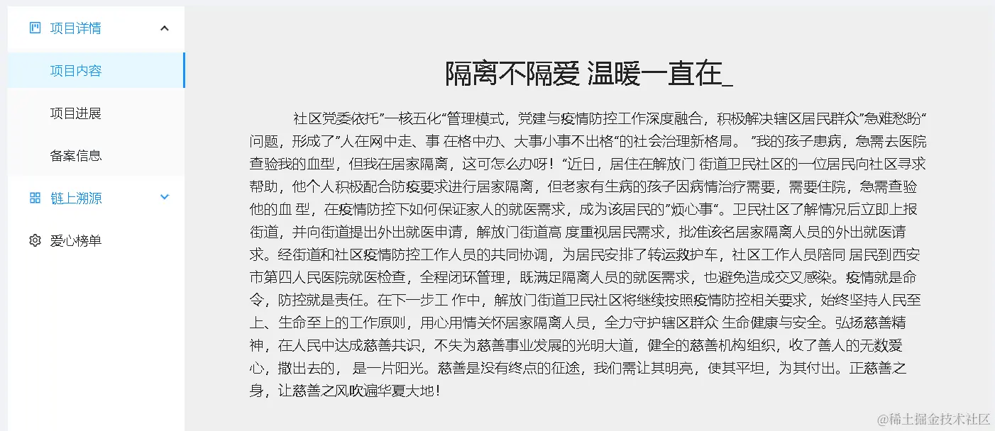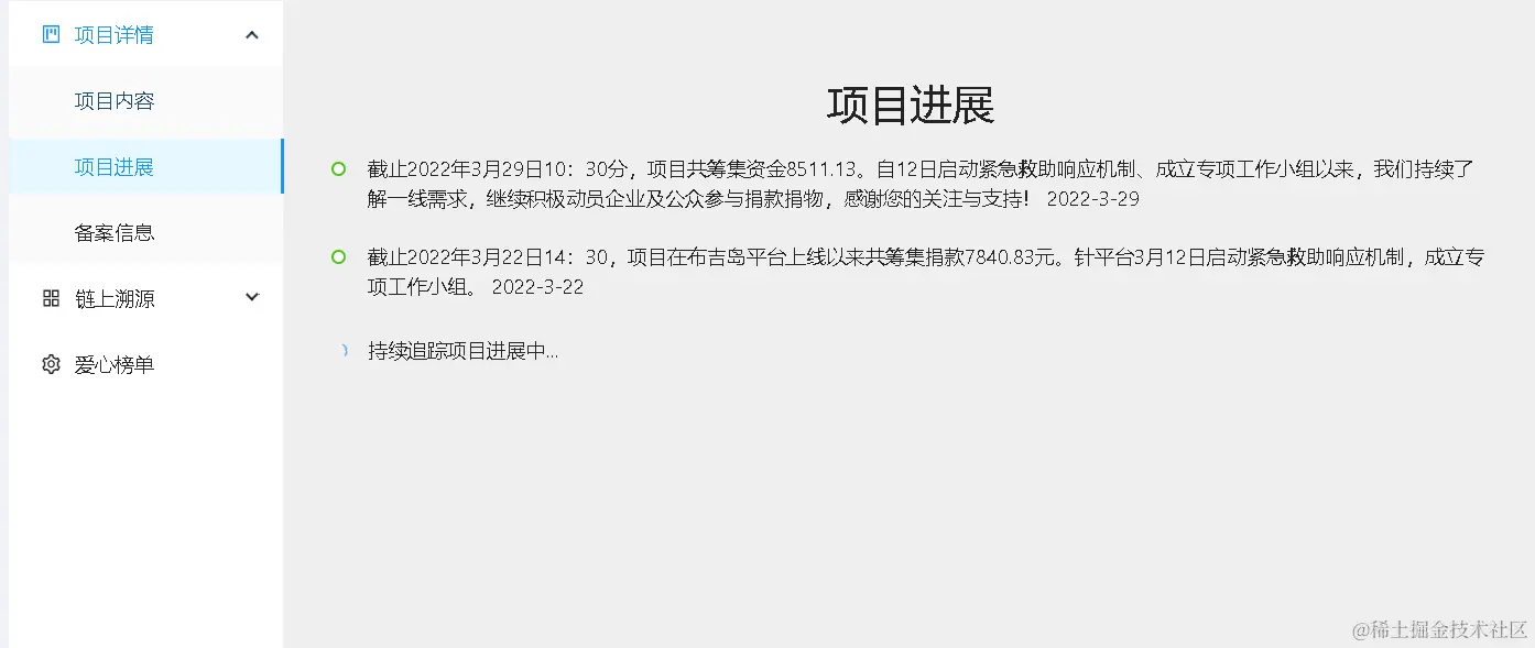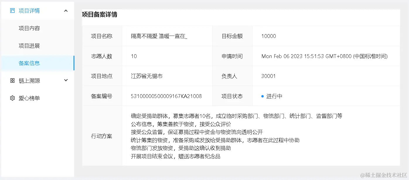 - 本版块展示了进行中项目的项目详尽的内容、区块链信息以及捐款记录,方便用户查阅和监督。