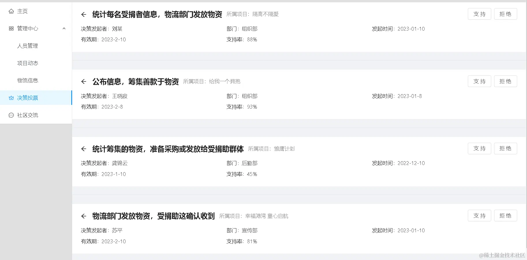 在本栏目中,DAO组织成员可以快速查看自己同事的基本信息、掌握项目的执行状态、查看慈善物资的配送情况等。