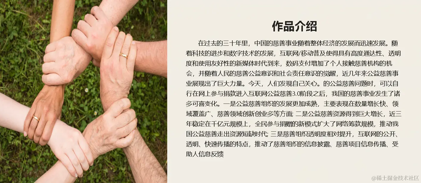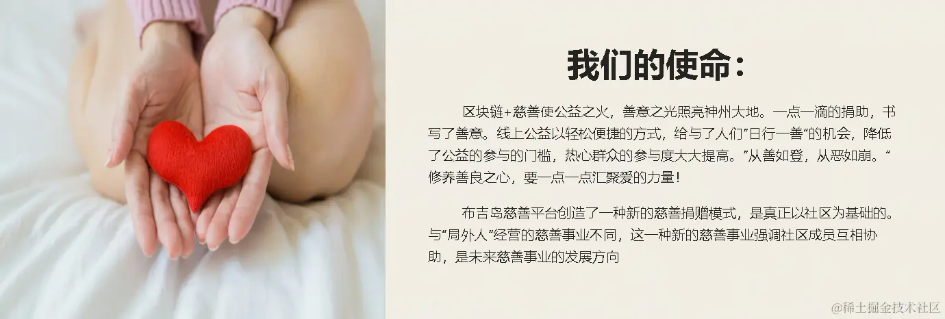 - 本版块展示了平台的慈善激励宣言,让用户能够理了解到慈善事业的意义以及区块链技术赋能慈善工作的先进性和优越性。