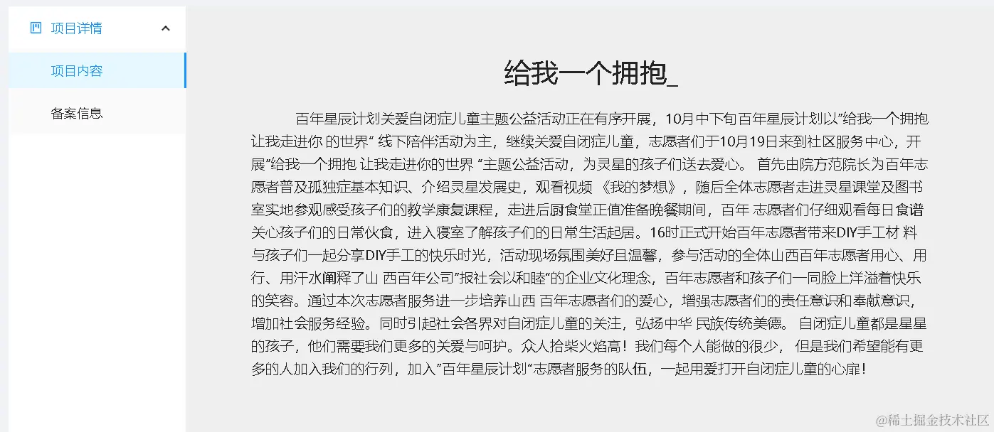 - 用户点击卡片可以进入对应项目详情界面,可以对项目进一步了解,以及参与志愿。