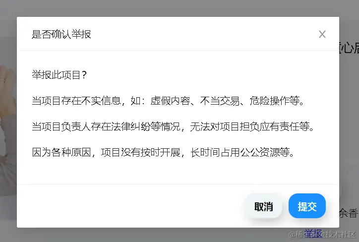 - 用户如果对对项目的真实性、公平性或执行公开性等有质疑,可以举报该项目。当举报数量或举报率达到一定程度后,相关部门会立即介入调查。