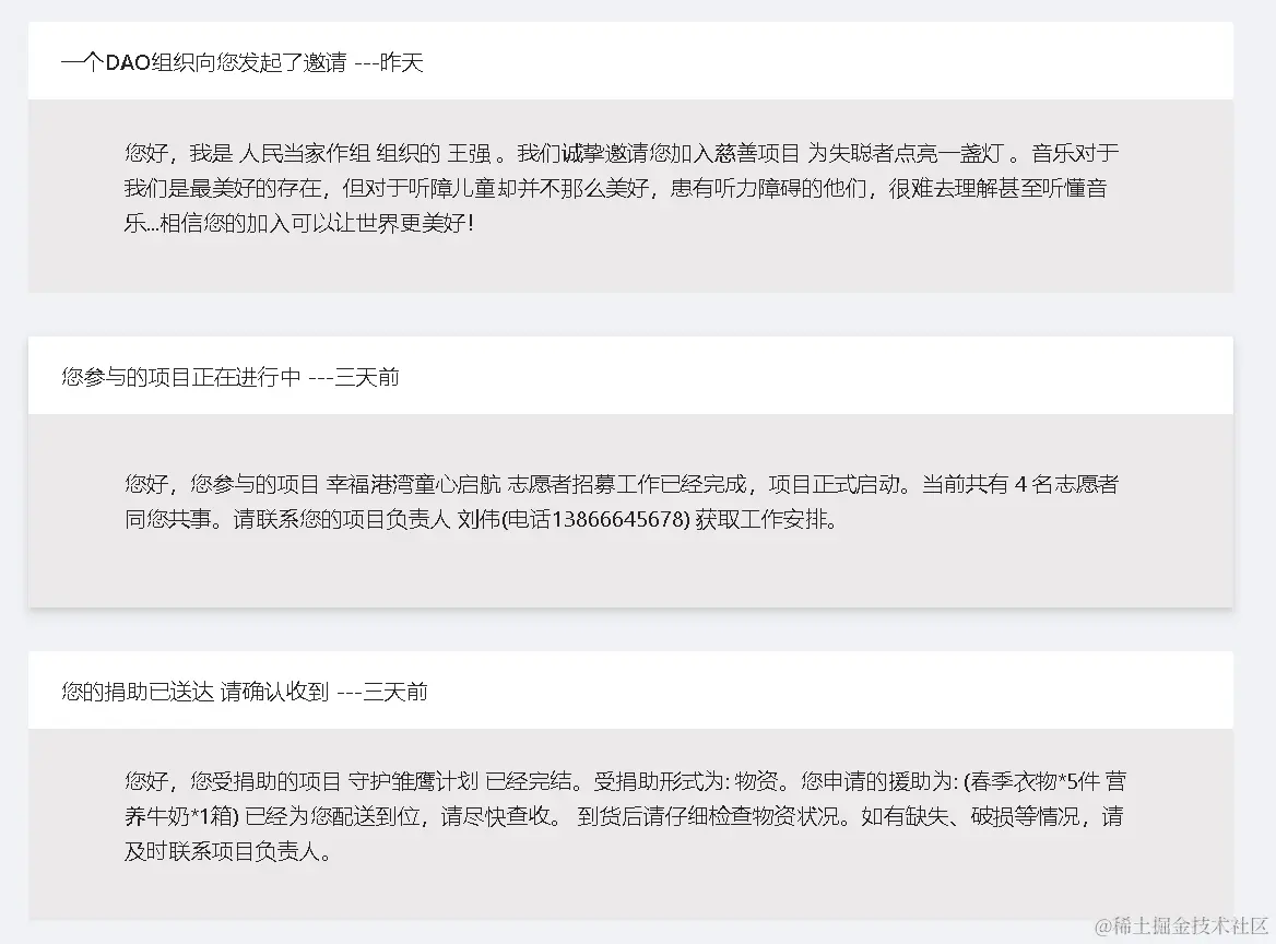 - 例如一个项目的捐赠者可以看到收到该项目执行关键节点的消息,方便捐赠者关注项目进度;项目的志愿者会收到可以展开工作和具体工作内容的消息;项目的受援助者则可以收到项目捐助物资的实时状态消息。