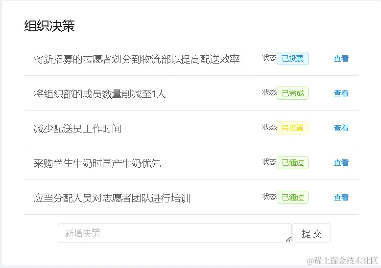 - 本版块显示了组织最新发布的决策,DAO成员可以便捷地查看这些决策以及自己的参与状态。