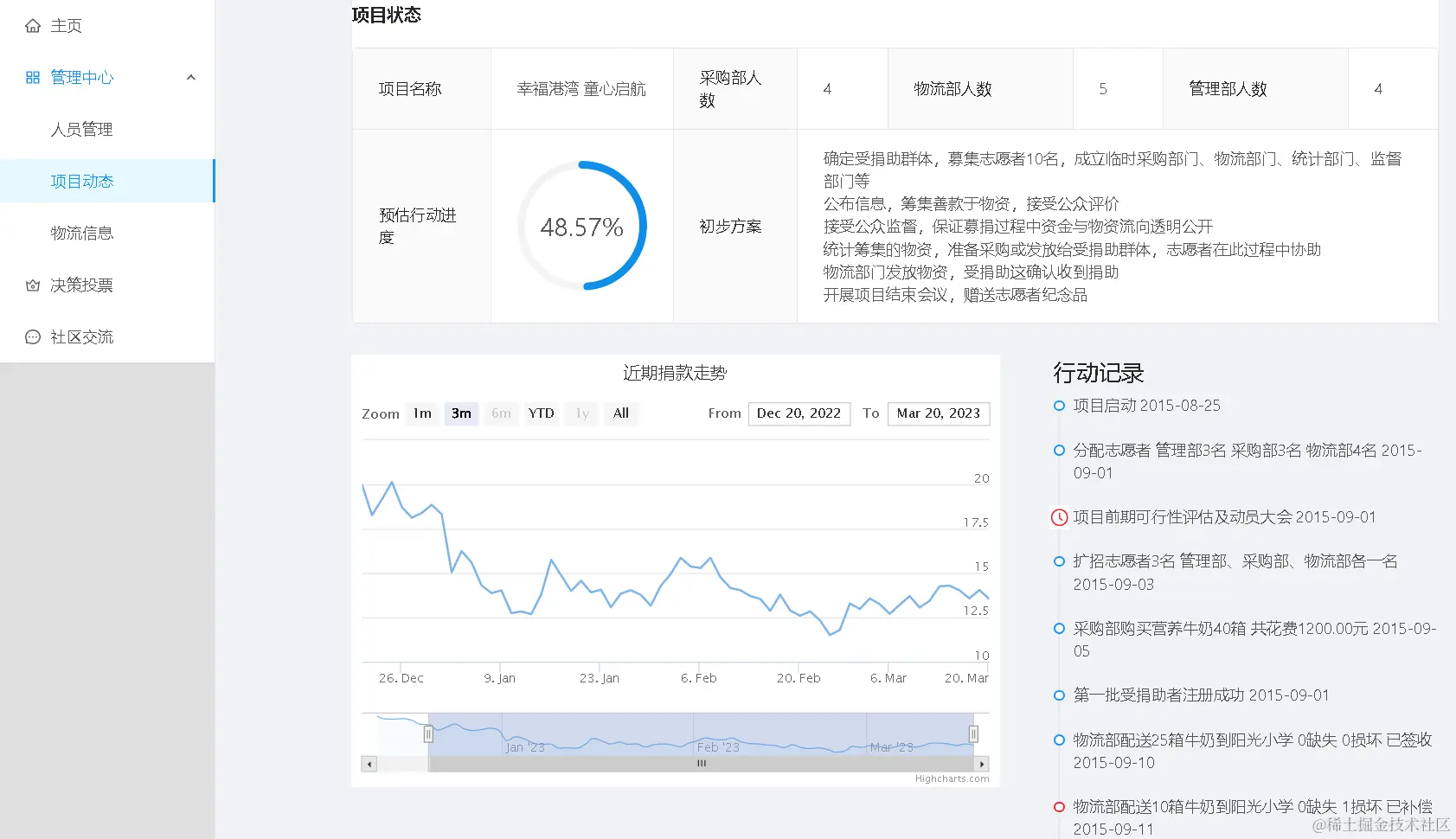 - 本板块展示了DAO组织在项目中的活动状态,包括任务进度、行动方案、近期捐资折线图、行动记录等。