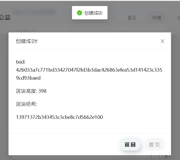 - 在填写相应表单并点击提交按钮之后,本项目所有信息将会上链。用户将会在区块链数据写入完成后收到该项目的创建成功提示以及区块链信息。