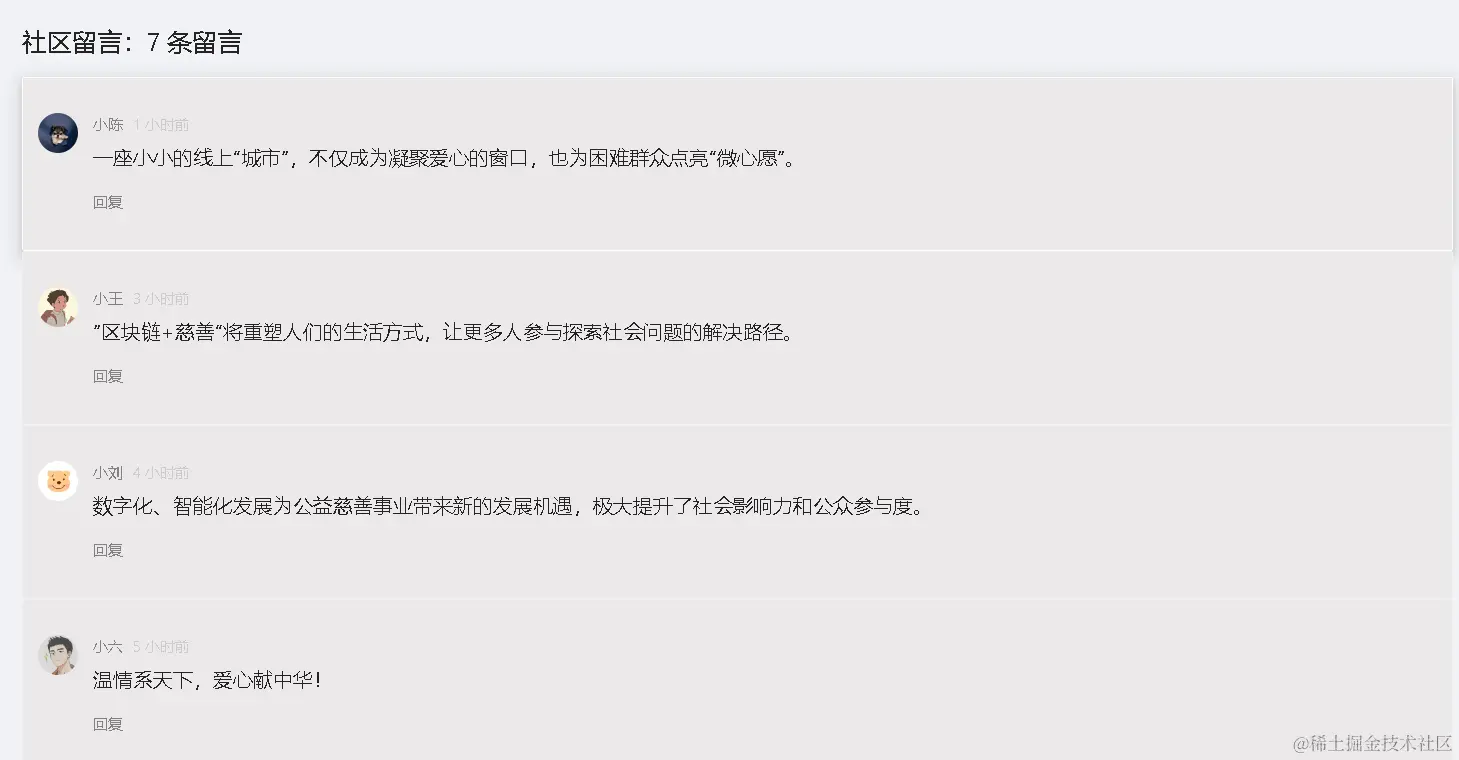 - 参与志愿或捐助慈善项目的用户可以发表自己对慈善项目的看法和心得,留言将会展示给每一位爱心人士。