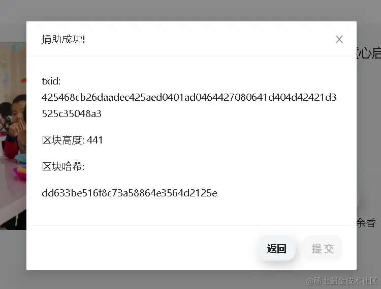 - 捐助成功后,用户的捐助记录将会被写入区块链,区块链完成写入过程后,网页将会显示捐助成功提示以及捐助记录区块链信息。