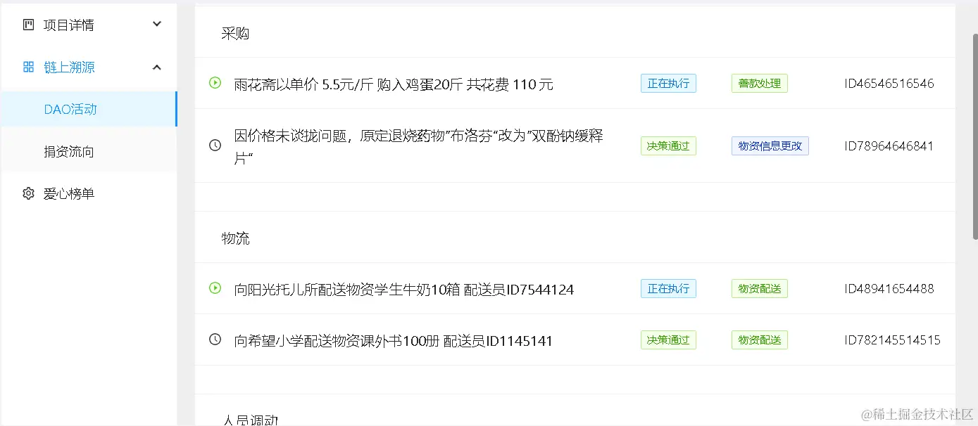 - 本版块展示了详细的物流信息,便于DAO组织监督资金流向和物资运输。
