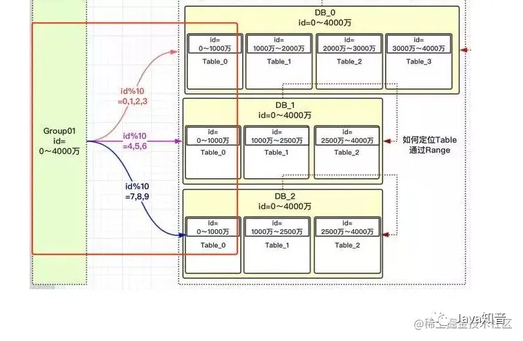 假如id为15000 然后对10取模(为啥对10 取模 因为有10个表),取0 然后 落在DB_0,然后在根据range 范围,落在Table_0 里面。总结:采用hash取模和range方案结合 既可以避免热点数据的问题,也有利于将来对数据的扩容
