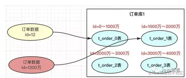 以范围进行拆分数据,就是在某个范围内的订单,存放到某个表中。比如id=12存放到user1表,id=1300万的存放到user2 表。优点:有利于将来对数据的扩容