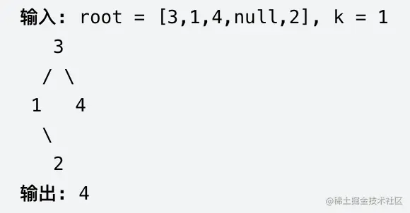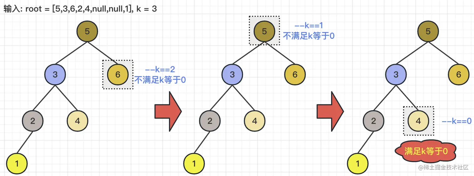 其中,当我们找到了第k大的数时,我们就可以通过是否result != -1(默认result等于-1)来进行终止遍历的判断了。好了,上面就是本题的解题思路,下面我们还是按照惯例,以输入: root = [5,3,6,2,4,null,null,1], k = 3为例,看一下题目的具体处理过程。请见下图所示: