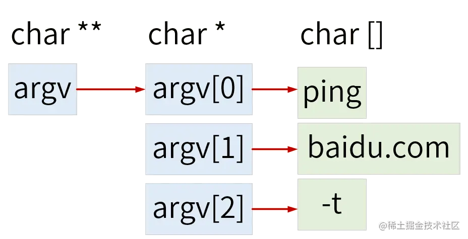 第二个参数是一个char **类型的指针,它指向元素类型为char *数组的首元素。数组中元素分别指向各字符串的首字符。