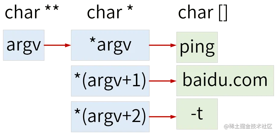 从二级指针 argv 获取到字符串首元素指针有两种办法,它们是等价的: