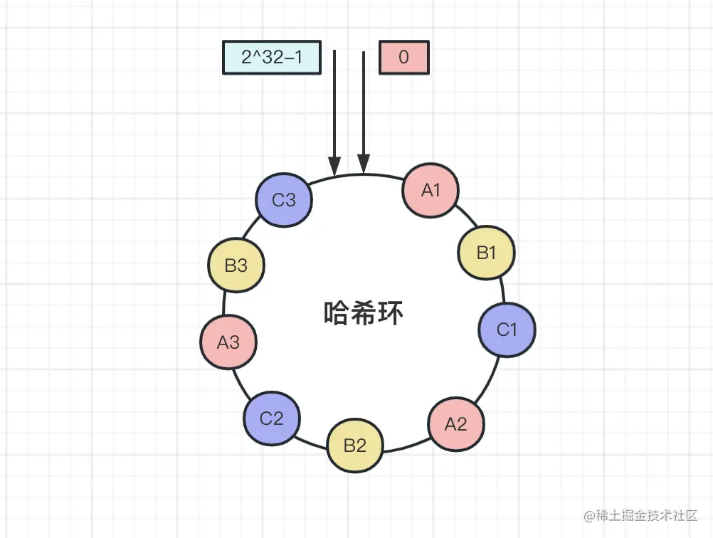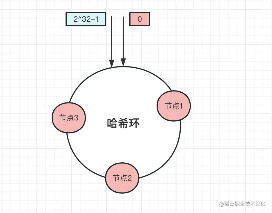 上面是一个哈希环,环上有2^32个节点。和上面取模算法一样,一致性哈希算法也是取模算法,不同的是一致哈希算法是对2^32个节点取模运算,哈希环的节点是固定的,取模运算结果值也是固定的。