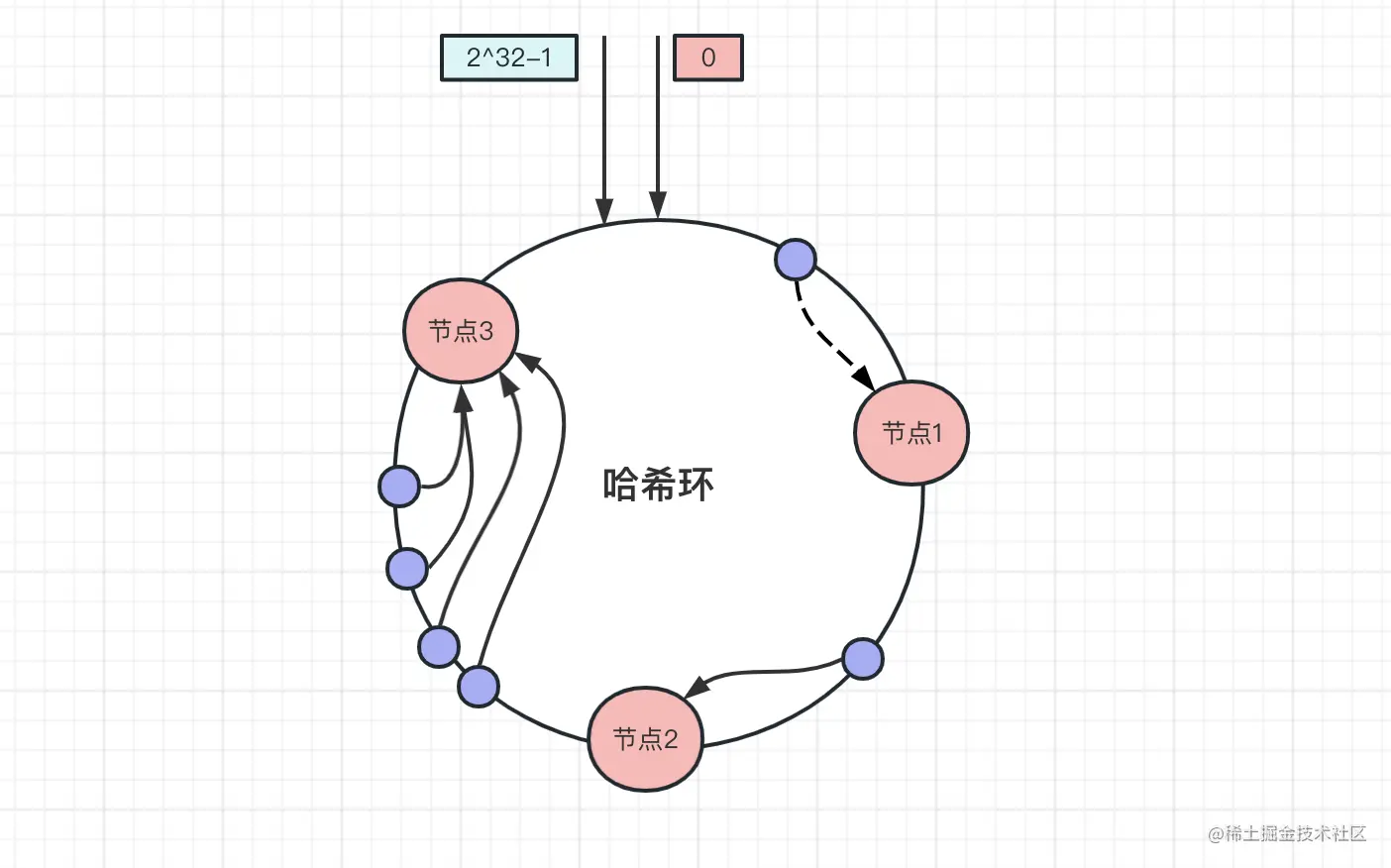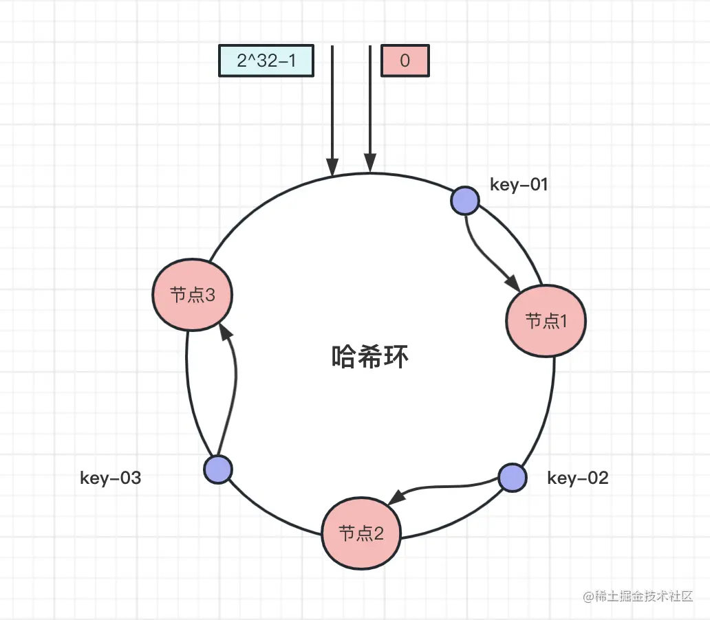 比如下图中数据key-01,先算出该数据在哈希环的位置,往顺时针方向找到第一个节点,也就是节点1,同理key-02、key-03顺时针分别找到节点2和节点3: