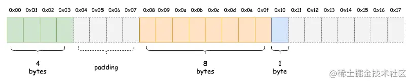 - 字段B 8字节:下标4-7,对8都不能整除,则填充空白,下标8可以整除,所以下标8-15 8个字节为字段B的存储使用;