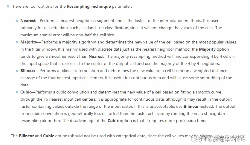 上述窗口中的参数整体也都很简单,也非常好理解;但主要是最后一个选项,也就是重采样方法的选择值得进一步探究。在实际应用过程中,我们究竟该选择哪一个方法呢?我们来看一下ArcGIS官网对不同方法的介绍;如下图所示。