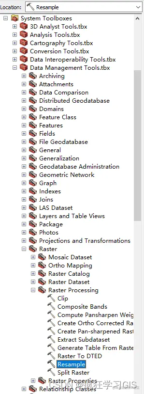 接下来,我们即可开始重采样操作。首先,在ArcMap软件中,依次选择“System Toolboxes”→“Data Management Tools.tbx”→“Raster”→“Raster Processing”→“Resample”选项;如下图所示。