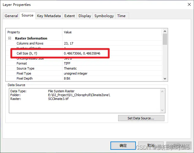 首先,如下图所示,是我们待重采样的栅格图像的属性界面。其中,可以看到此时栅格像元的边长为0.4867左右(由于图层是地理坐标系,所以单位就是度)。