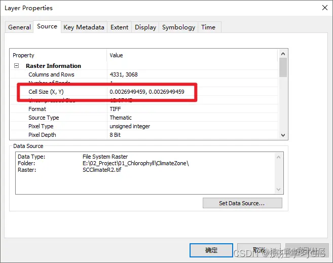 重采样后,可以看到结果数据中像元的大小已经是我们需要的数值了。