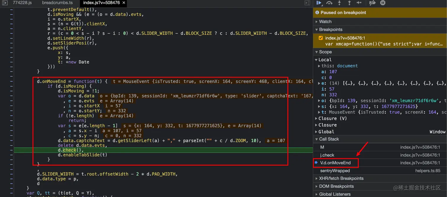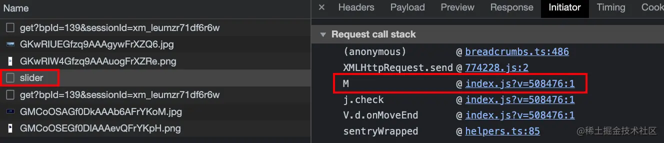废话不多说,直接开始调试分析。我们需要定位到这个参数是如何生成的。我个人目前比较习惯直接通过请求的调用栈来做定位。点击 slider 请求,可以找到下图的方法中出现了我们想要分析的参数:
