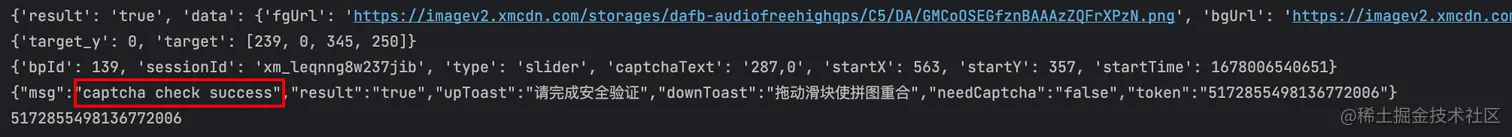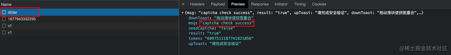 若滑到了正确位置,则会返回验证成功的信息和一个 token 值: