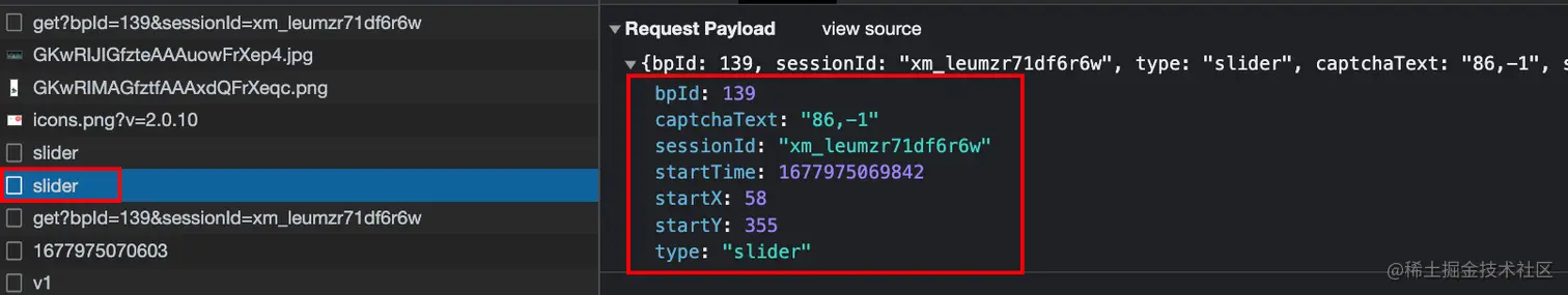 这里最关键的是滑块验证请求 slider 。