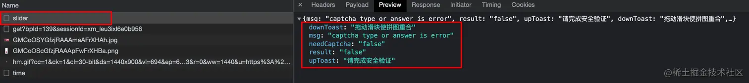 滑块后,会发送一个 slider 请求。如果没滑到正确位置,会返回验证失败的响应信息: