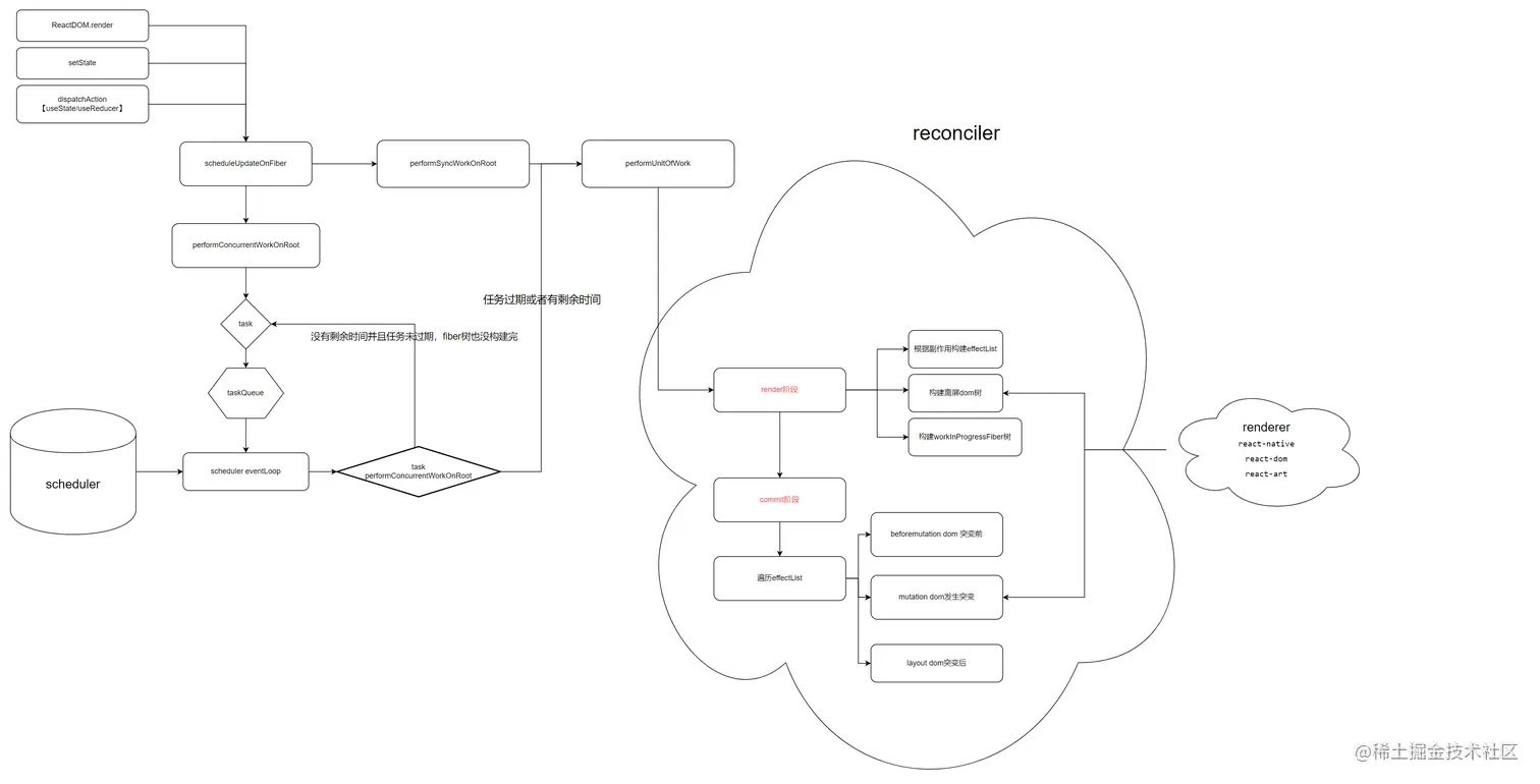 React组件初次构建/触发更新产生新的reactElement,reconciler将其构建成新的fiber树,找出对比需要更新的fiber链表,被称为effectList, 结合renderer完成视图更新与渲染