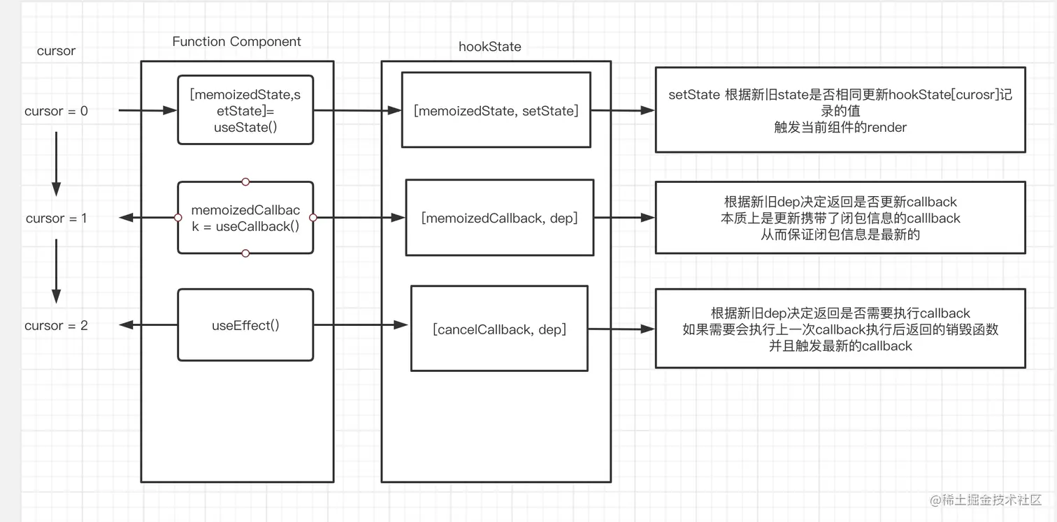 那不禁会问,我们讲了这么多原理性的demo,会不会跟源码差别很大呢 ? 其实思想都是差不多的,在看了原理demo之后,我们对hooks的实现有了比较浅显的理解,再去看举一个源码例子,也显得更加容易理解了。