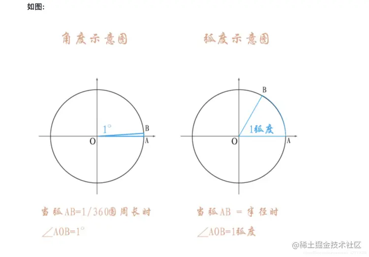 弧度 = 角度 * PI / 180 或 2 * PI / 360
