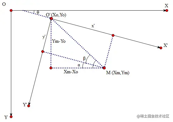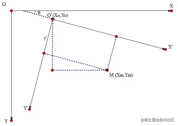 平面内一个直角坐标系XOY,经过平移、顺时针旋转θ角度后形成新的直角坐标系X'O'Y',已知O'在XOY坐标系中的坐标为(Xo,Yo),点M在XOY坐标系中的坐标为(Xm,Ym),求M在X'O'Y'坐标系中的坐标(x',y')。