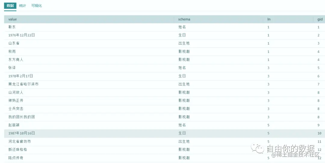在数据集中包括演员的基本信息,以及主演的影视作品信息。我们的目标就是尽可能得抽取同类关系数据。