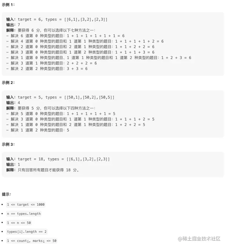 返回你在考试中恰好得到 target 分的方法数。由于答案可能很大,结果需要对 109 +7 取余。