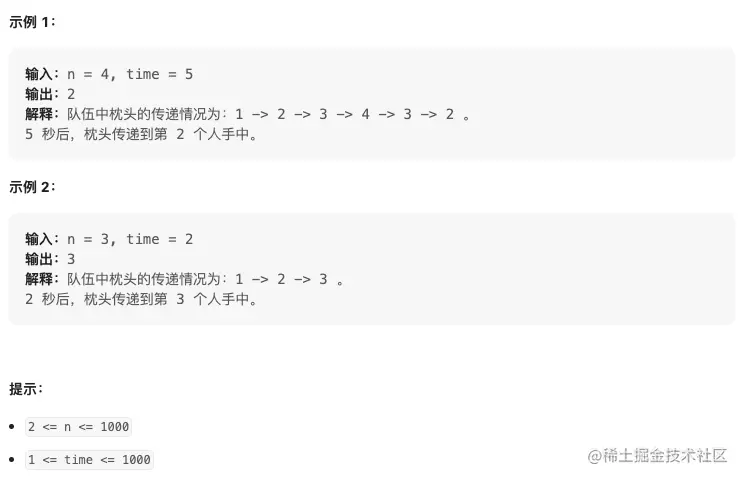最初,排在队首的第一个人拿着一个枕头。每秒钟,拿着枕头的人会将枕头传递给队伍中的下一个人。一旦枕头到达队首或队尾,传递方向就会改变,队伍会继续沿相反方向传递枕头。