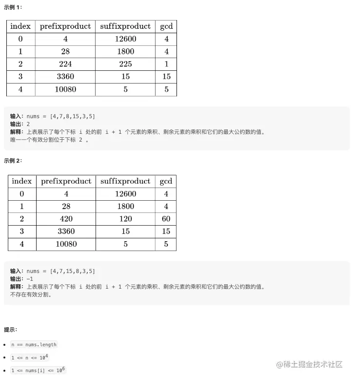 如果在下标 i 处 分割 数组,其中 0 <= i <= n - 2 ,使前 i + 1 个元素的乘积和剩余元素的乘积互质,则认为该分割 有效 。