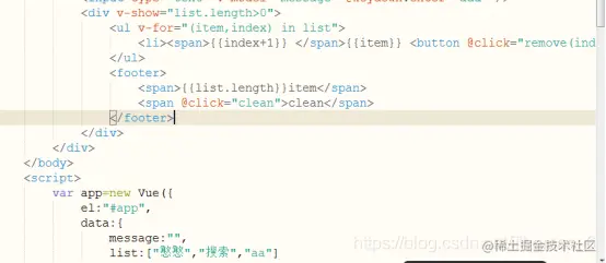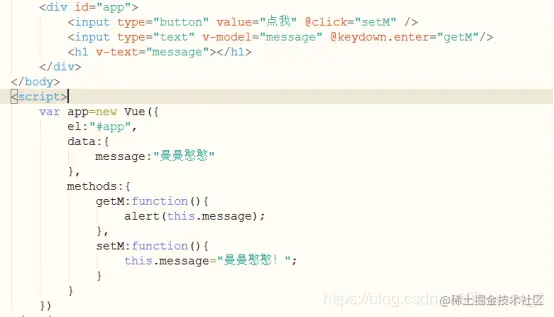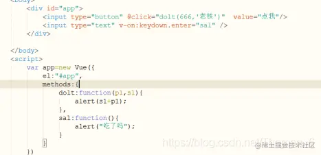 4. v-on,v-on可简写为@,v-on可以绑定vue实例中methods的方法,语法为v-on触发方式=”方法名(参数)”,如图所示