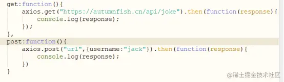 Axios发送请求的方法分为两种:get和post,使用方法如下
