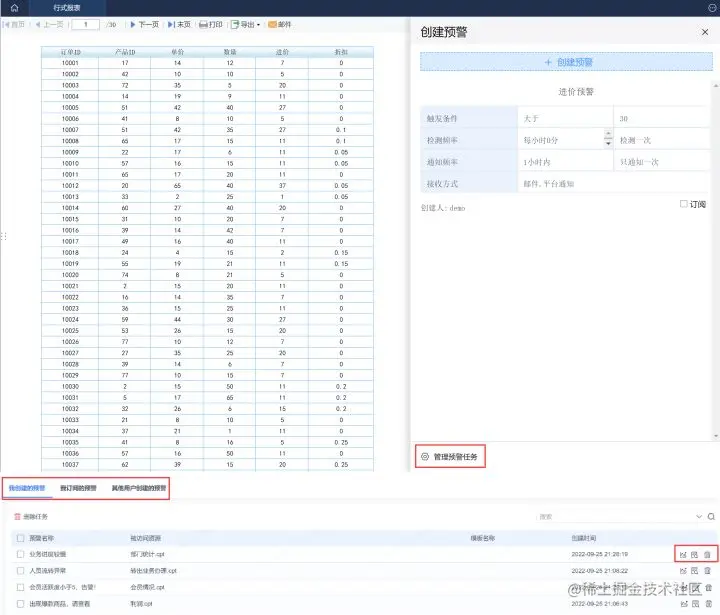用户在使用 FineReport 报表进行数据展示的同时,支持由业务用户在查看模板时自行创建数据监控预警,系统在发现异常时发送通知来实现对异常数据进行日常监控。