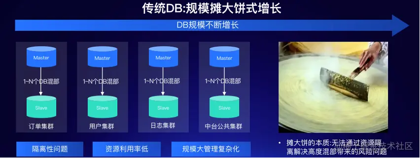 这是传统单机数据库的三宗罪。存储的扩展在一定程度内可以通过堆硬件(垂直扩容)的方式来解决,但堆硬件也是有限度的,出于可运维、易运维的角度,通常DBA都不会让单实例或者单表太大。可能对于一个冷的日志表存储超过1TB DBA可能就会比较紧张了,毕竟DDL一次可能要以天计算,而对于一个读写高频的订单表超过500GB,估计DBA维护就会如履薄冰瑟瑟发抖了!这时棘手的问题就来了:给够你硬件你都不敢用。